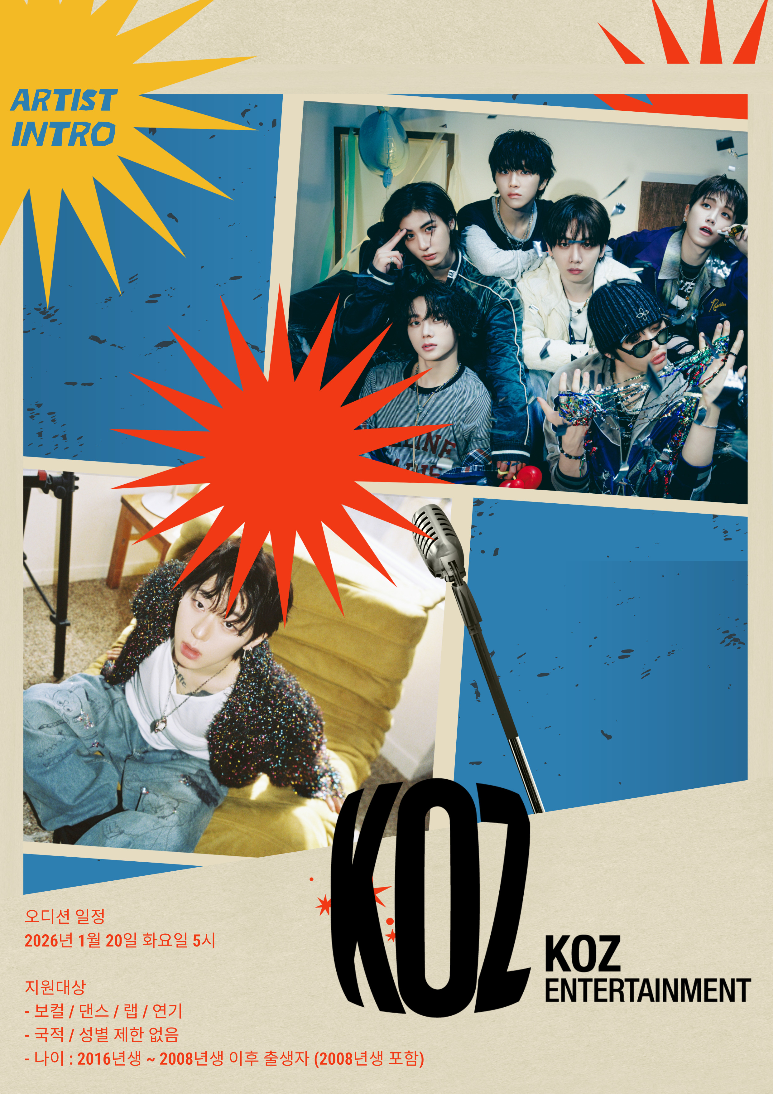 아무노래 챌린지의 열풍을 일으켰던 #zico 가 이끄는!! k-pop 최고 아이돌 #boynextdoor 가 소속되어있는 #kozentertainment 내방오디션이 진행됩니다!! 이번에는 가즈아~~ 맹구야!!! 오디션 일시 : 2026년 1월 20일 (화요일) 5시 1. 오디션 참가자 성별/국가 무관 - 2016 ~ 2008년 출생자 ⭐️ 참가자 연령 제한 반드시 확인 부탁드립니다. 2. 보컬 / 랩 / 댄스 / 연기 중 가장 자신 있는 분야 ’한 가지‘ 선택 - 보컬 / 랩 : 무반주, 1절 - 댄스 : 음악 준비, 1곡 1절 - 연기 : 자유 연기 1분 내외 - 신청 : https://mh.bornstar.co.kr/audition/